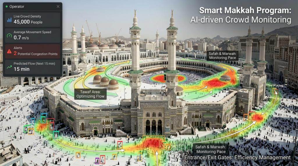 Salah satu inisiatifnya adalah program “Smart Makkah”, yang menggunakan kecerdasan buatan untuk memantau dan mengelola pergerakan massa di Masjidil Haram dan area sekitarnya.